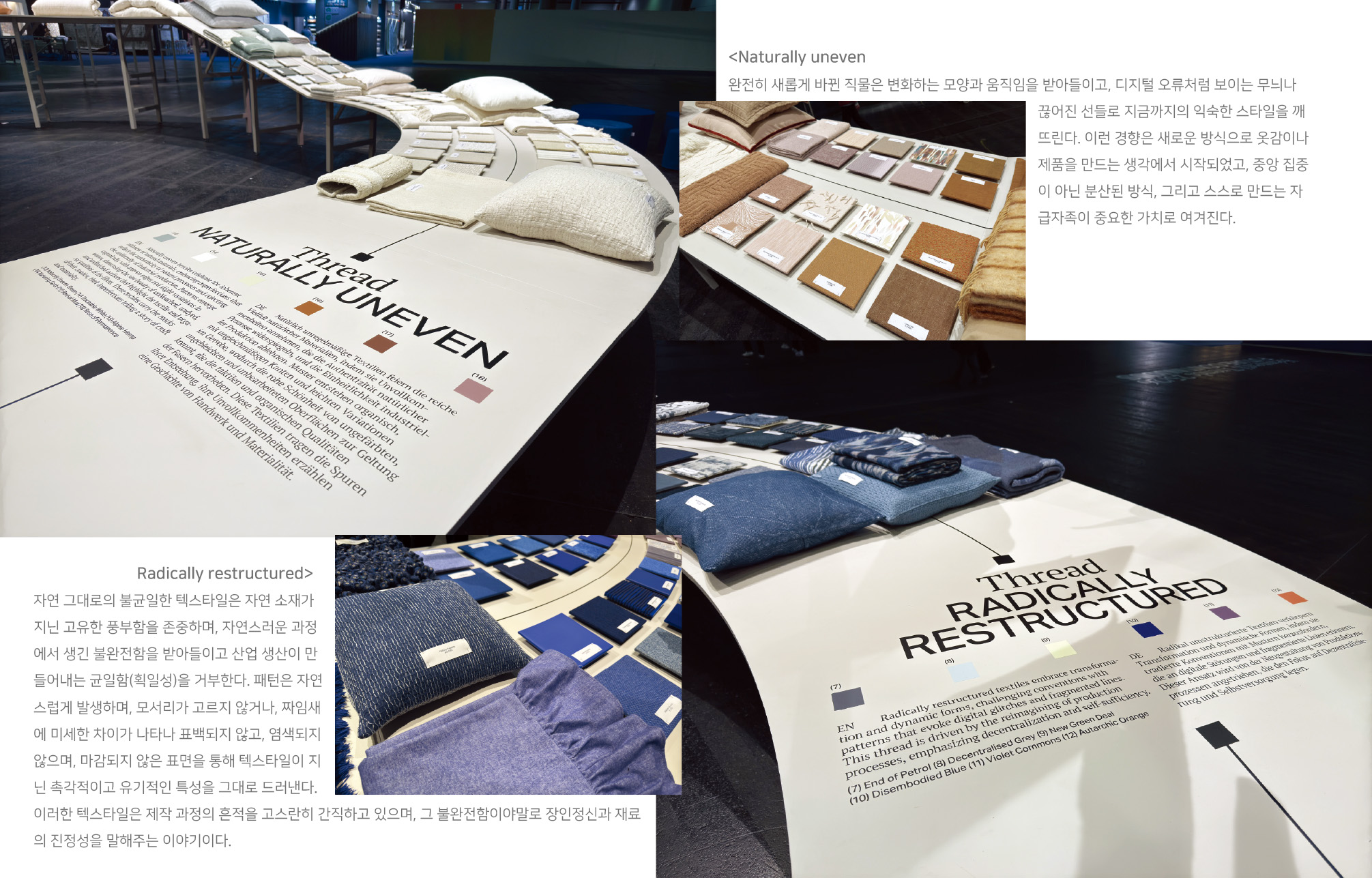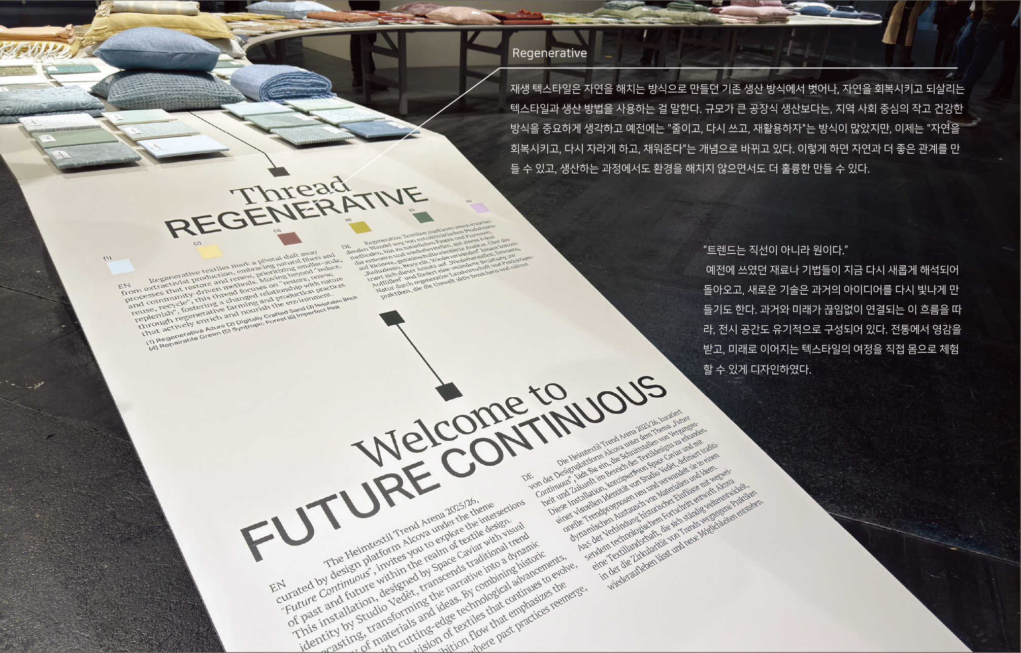 재생 텍스타일은 자연을 해치는 방식으로 만들던 기존 생산 방식에서 벗어나, 자연을 회복시키고 되살리는 텍스타일과 생산 방법을 사용하는 걸 말한다. 규모가 큰 공장식 생산보다는, 지역 사회 중심의 작고 건강한 방식을 중요하게 생각하고 예전에는 "줄이고, 다시 쓰고, 재활용하자"는 방식이 많았지만, 이제는 "자연을 회복시키고, 다시 자라게 하고, 채워준다"는 개념으로 바뀌고 있다. 이렇게 하면 자연과 더 좋은 관계를 만들 수 있고, 생산하는 과정에서도 환경을 해치지 않으면서도 더 훌륭한 만들 수 있다. “트렌드는 직선이 아니라 원이다.” 예전에 쓰였던 재료나 기법들이 지금 다시 새롭게 해석되어 돌아오고, 새로운 기술은 과거의 아이디어를 다시 빛나게 만들기도 한다. 과거와 미래가 끊임없이 연결되는 이 흐름을 따라, 전시 공간도 유기적으로 구성되어 있다. 전통에서 영감을 받고, 미래로 이어지는 텍스타일의 여정을 직접 몸으로 체험할 수 있게 디자인하였다.