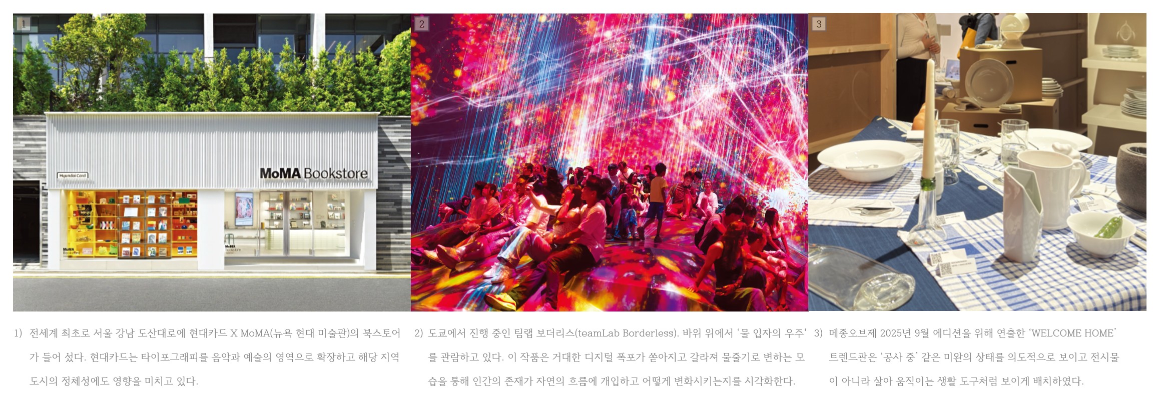 최근에는 24시간 무급 비서라는 오픈 클로 OPEN CLAW의 등장으로 향후 2~3년 안에 우리의 생활 전반에 AI가 깊숙이 관여할 것이라 하였다. 많은 트렌드 분석가들은 한결같이 AI 빼놓지 않고 이야기한다. 누군가는 AI를 대수롭지 않게 받아들여야 한다고 말하고 누군가는 날을 세워 부정적인 시각으로 인간의 위협이라 말한다. 둘 다 맞는 이야기지만 무엇보다 중요한 것은 우리에게 주어진 시간은 유한하고 이에 대한 경험은 중요하며 경험을 통해 '내가 누구'인지에 대한 명확한 자각이 필요하다는 것이다.이럴 때 강조하는 이번 주제 '존재의 감각'은 무뎌진 우리의 오감을 일깨워 세상의 모든 것을 느껴보는 것. 이것이야말로 AI의 시대에 우리가 흔들리지 않고 나로서 살아갈 수 있지 않을까 싶다. 이것은 한 사람의 개인의 문제가 아닌 한 기업에 대입하여 생각해 봐도 될 것이다. 그렇다면 지금 가장 듣기 좋은 말은 'OOO은 참 감각적인 분이시네요', ' OO은 감각 있는 회사 같아요.'라는 말일 듯싶다. 감각은 나이가 들수록 무뎌지는 것이 아니라 단련할수록 뿜어지는 아우라에 가깝다. AI의 시대. 감각의 회복은 지금도 늦지 않았다.
